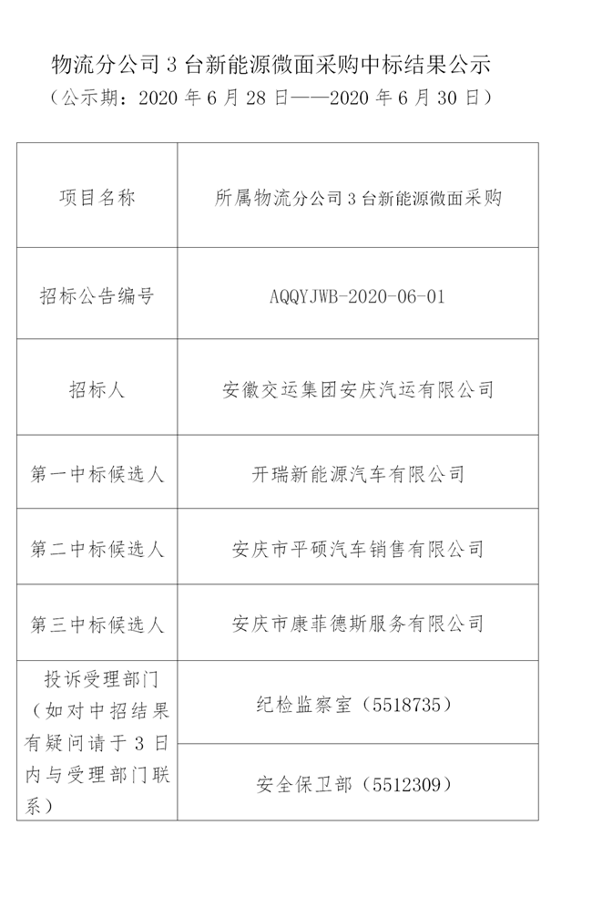 物流分公司3臺新能源微面采購中標(biāo)結(jié)果公示