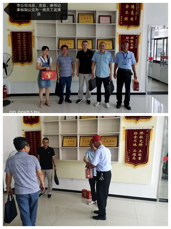隨著夏季高溫來臨,為進一步做好暑期安全生產(chǎn)和防暑降溫工作,7月3日下午,公司副總經(jīng)理馮定春、總經(jīng)理助理左普慶一行到樅陽公交分公司“送清涼”,親切慰問高溫下堅守一線崗位的駕駛員和工作人員,并送上消暑物品。