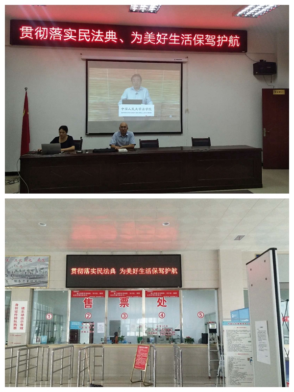 7月14日,岳西分公司在車站站前廣場電子屏幕上滾動播放了“貫徹落實民法典,為美好生活保駕護(hù)航”等宣傳標(biāo)語。