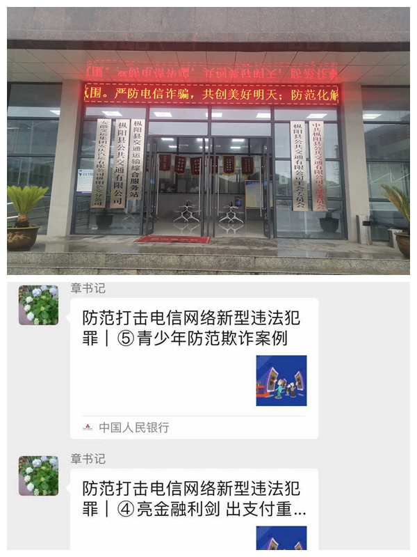 公司領(lǐng)導(dǎo)高度重視,精心組織,在公司電子屏和公交車尾電子屏循環(huán)播放宣傳標(biāo)語,在公司職工微信群轉(zhuǎn)發(fā)《致全市財(cái)務(wù)人員的一封信》、《致全體學(xué)生及家長的一封信》,進(jìn)一步提高職工及廣大人民群眾對各類電信網(wǎng)絡(luò)詐騙的自我防范意識,增強(qiáng)法治意識,提高維權(quán)能力,切實(shí)打擊電信網(wǎng)絡(luò)詐騙。