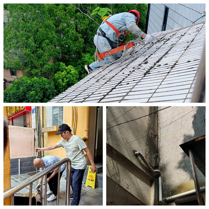 8月安全巡查期間,綜合服務(wù)中心安全科針對紡織南路7號樓及周邊區(qū)域開展專項(xiàng)隱患排查,發(fā)現(xiàn)兩處亟待處理的安全問題:一是7號樓公廁外側(cè)落水管多處破裂,導(dǎo)致雨水滲漏至路面并形成大面積積水,不僅影響市容環(huán)境,更對過往車輛及行人構(gòu)成潛在風(fēng)險;二是慶達(dá)綜合樓頂層臨街面瓷磚多處開裂,縫隙中滋生的灌木根系已侵入建筑結(jié)構(gòu),存在高空墜物隱患,嚴(yán)重威脅公共安全。